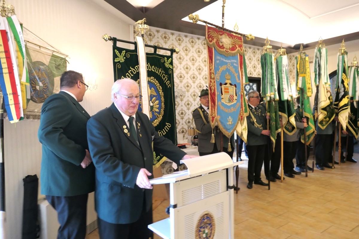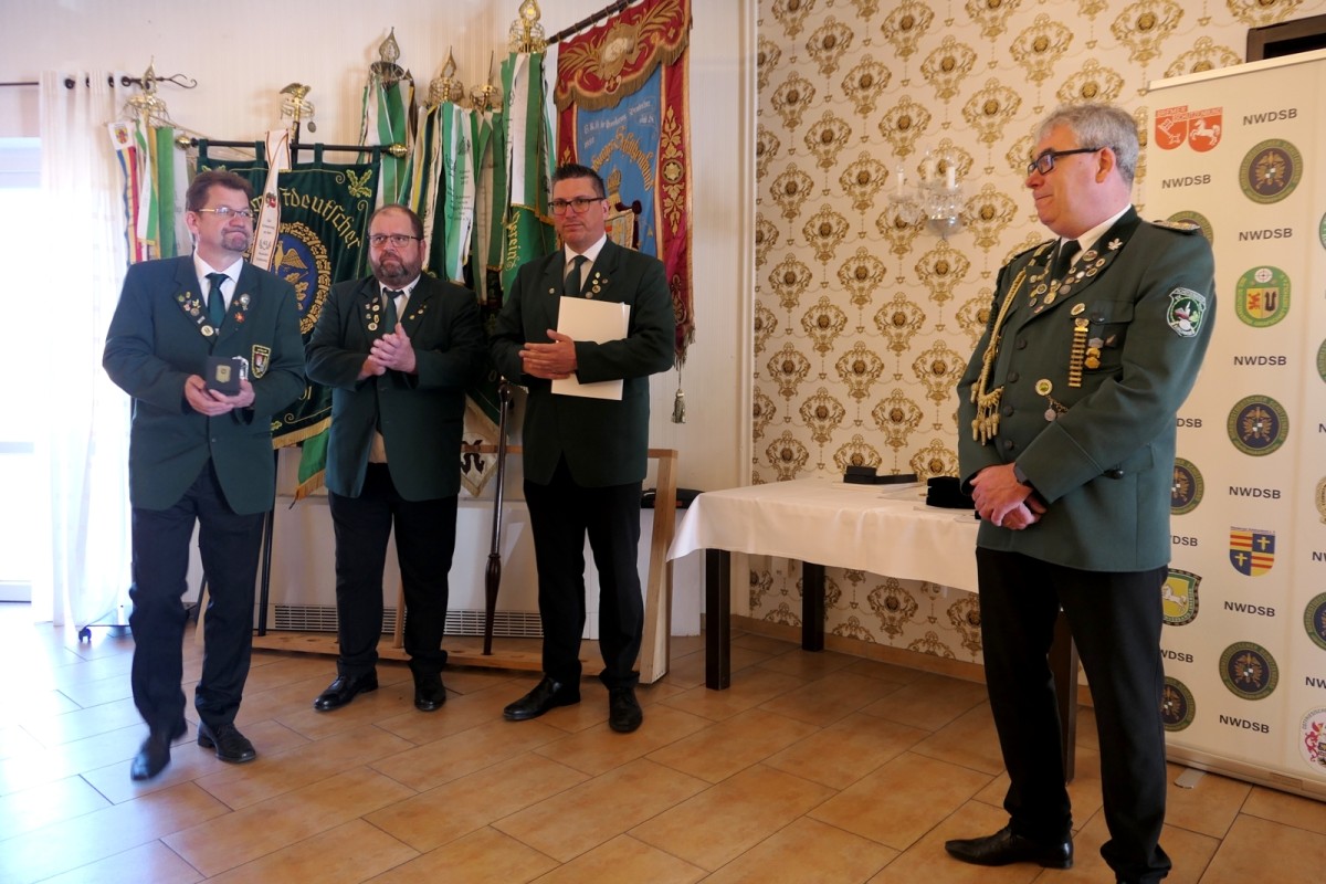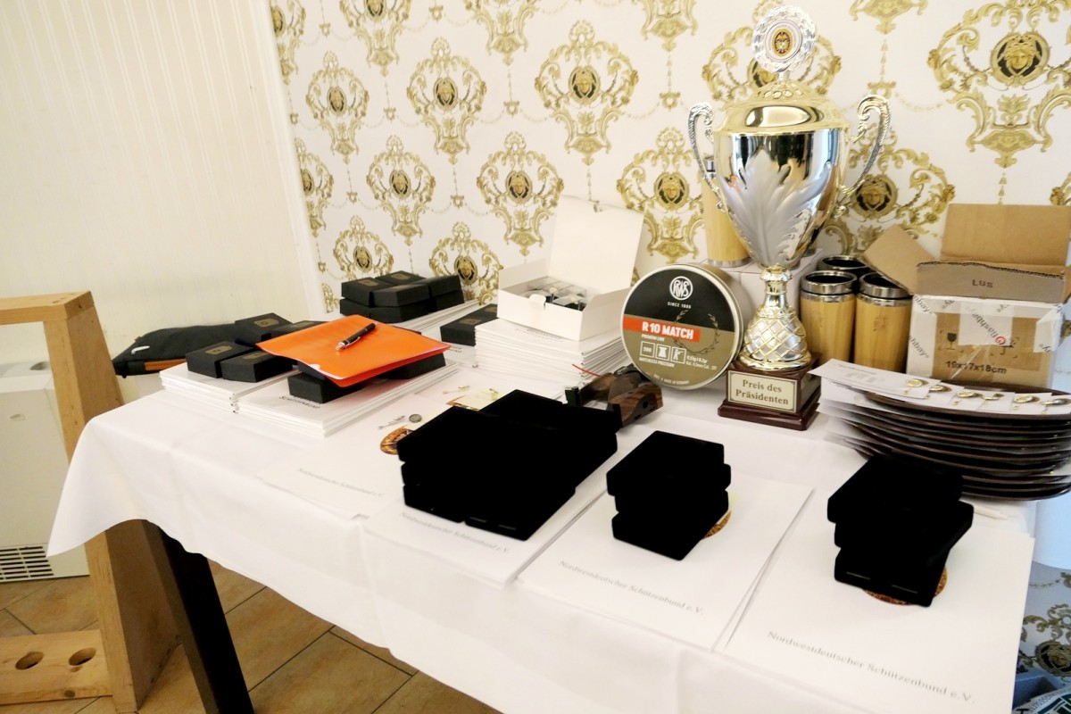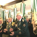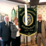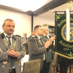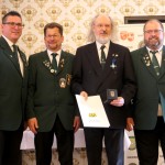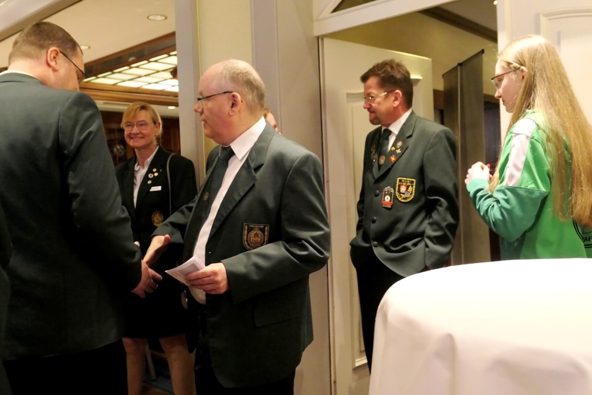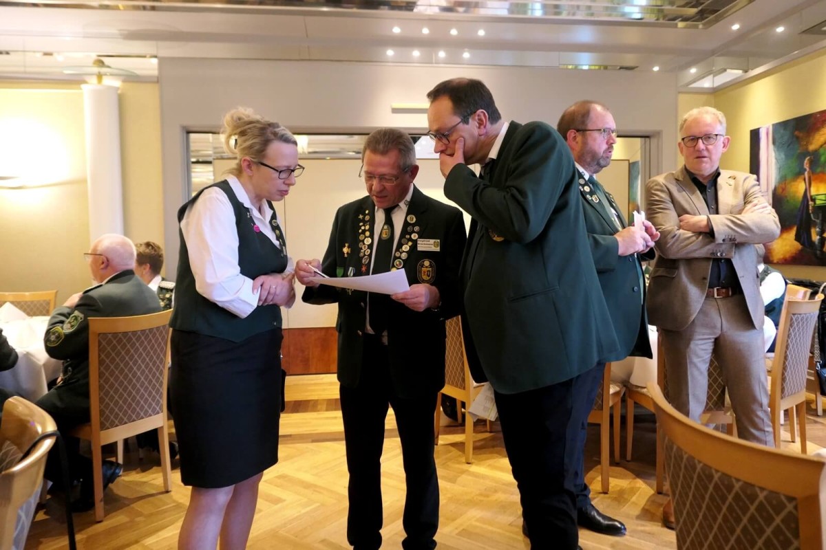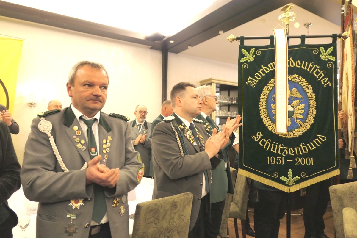 Als letzte wurden die Organisatoren des 72. Landesschützentages auf die "Bühne" gebeten und geehrt. Sie alle erhielten als eine Erinnerung und Dank für ihre Arbeit, einen Trinkbecher mit NWDSB-Emblem versehen vom Geschäftsführer Volker Kächele. Von links: Bezirkspräsident Karl-Friedrich Scharrelmann, Ulrich Ehlers, Friedel Kelkenberg, Thomas Nowak, Britta Löhmann, Lena Löhmann, Bianca Meyer, Marianne Vallan u. Siegfried Brockmann.