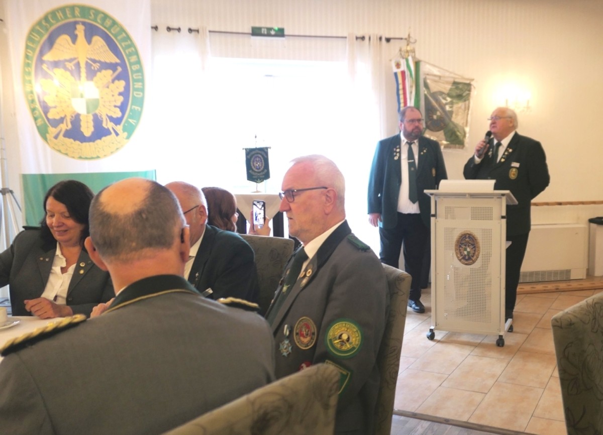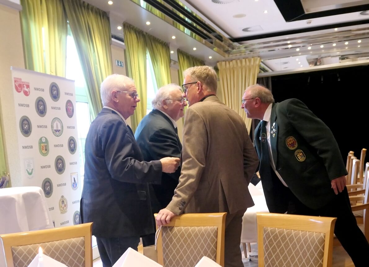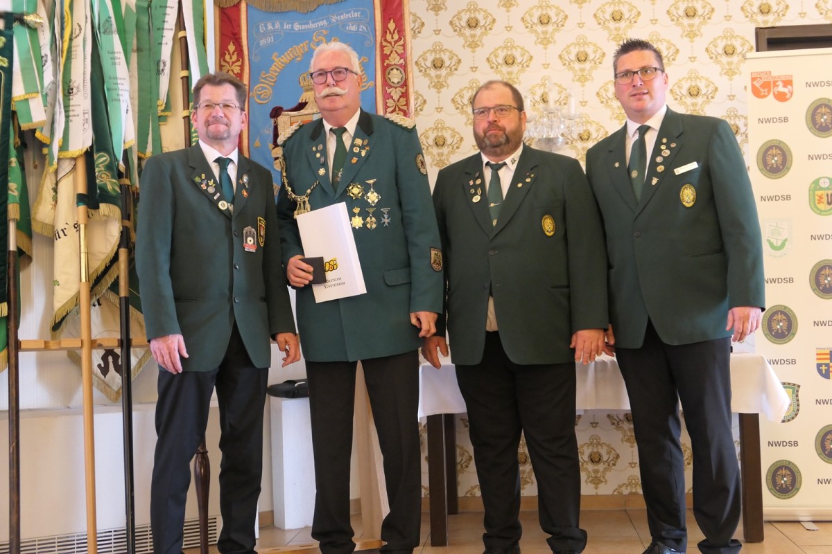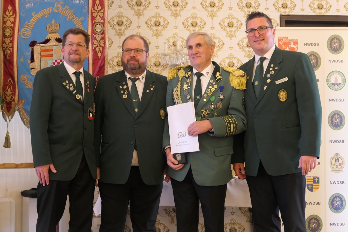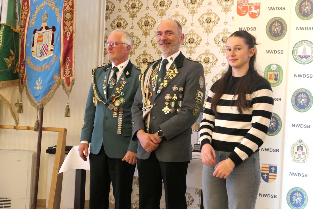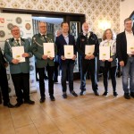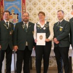 Als letzte wurden die Organisatoren des 72. Landesschützentages auf die "Bühne" gebeten und geehrt. Sie alle erhielten als eine Erinnerung und Dank für ihre Arbeit, einen Trinkbecher mit NWDSB-Emblem versehen vom Geschäftsführer Volker Kächele. Von links: Bezirkspräsident Karl-Friedrich Scharrelmann, Ulrich Ehlers, Friedel Kelkenberg, Thomas Nowak, Britta Löhmann, Lena Löhmann, Bianca Meyer, Marianne Vallan u. Siegfried Brockmann.