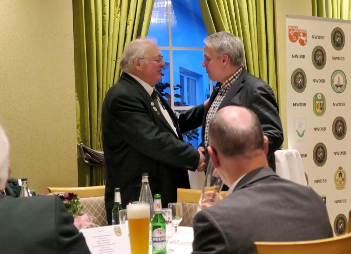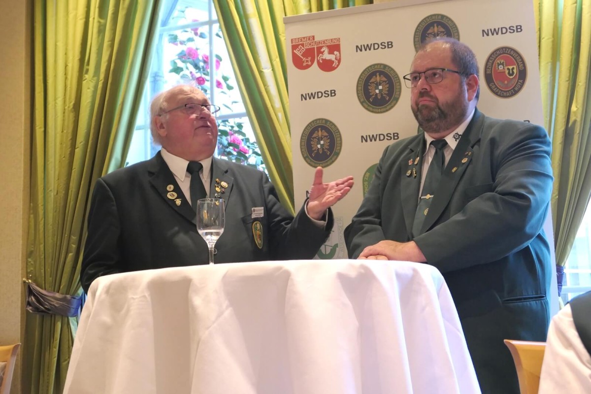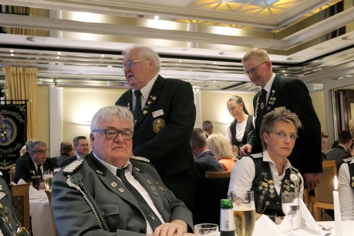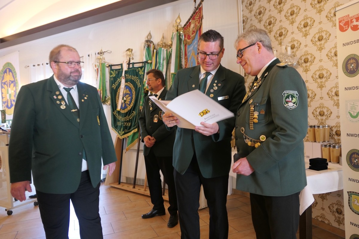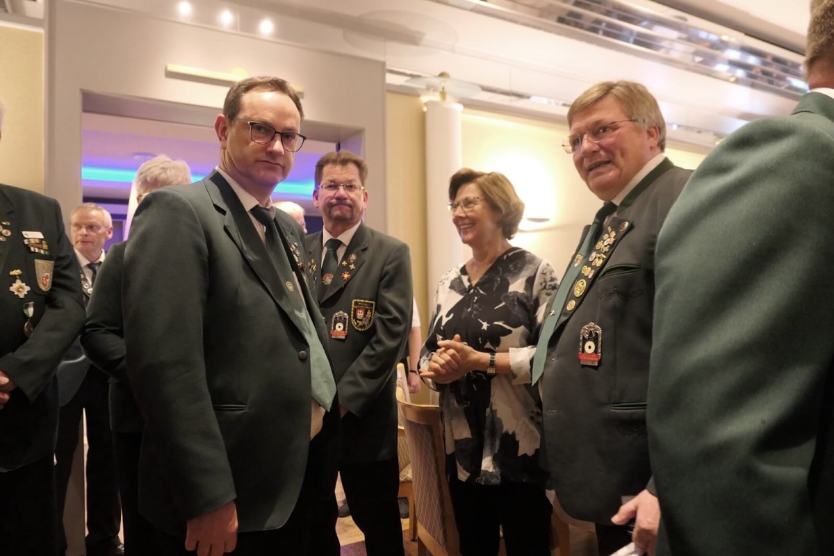 Als letzte wurden die Organisatoren des 72. Landesschützentages auf die "Bühne" gebeten und geehrt. Sie alle erhielten als eine Erinnerung und Dank für ihre Arbeit, einen Trinkbecher mit NWDSB-Emblem versehen vom Geschäftsführer Volker Kächele. Von links: Bezirkspräsident Karl-Friedrich Scharrelmann, Ulrich Ehlers, Friedel Kelkenberg, Thomas Nowak, Britta Löhmann, Lena Löhmann, Bianca Meyer, Marianne Vallan u. Siegfried Brockmann.